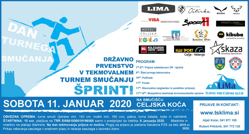 Zaradi visokih temperatur in slabih snežnih pogojev na smučišču Celjska koča prestavljamo Dan turnega smučanja in Državno prvenstvo v tekmovalnem turnem smučanju - šprinti na soboto, 11. januar 2020.