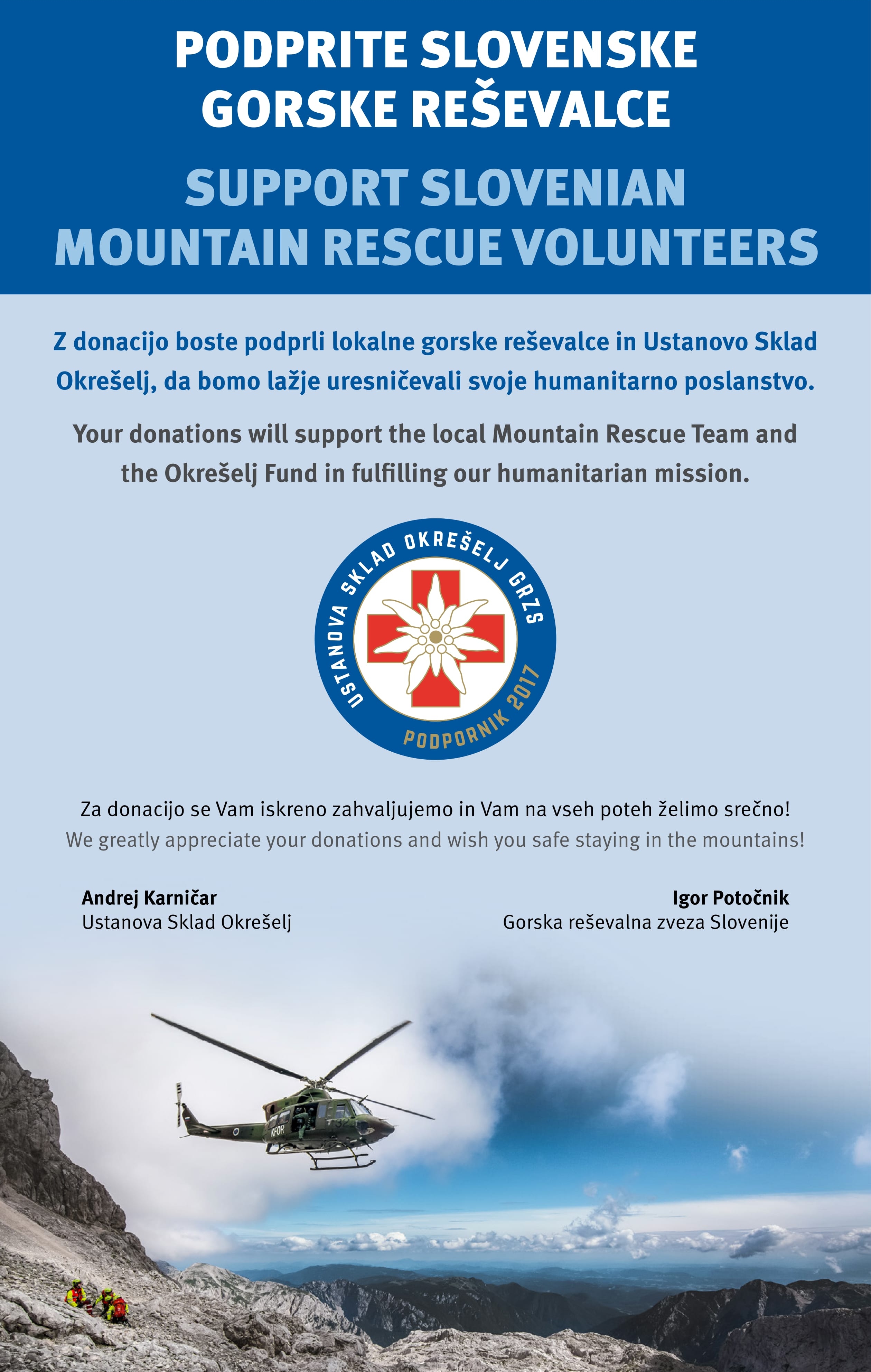 Z donacijo boste podprli lokalne gorske reševalce in Ustanovo Sklad Okrešelj, da bodo lažje uresničevali svoje humanitarno poslanstvo.