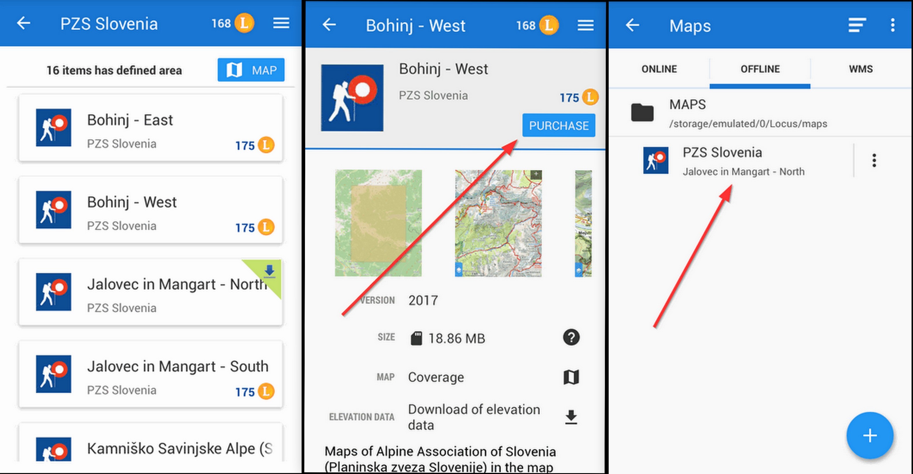 V aplikaciji Locus Map slovenske planinske zemljevide najdete v Locus Store pod zavihkom Europe > Slovenia > PZS Slovenia. Namestitev je standardna, kot v primeru drugih načinov offline prenosa. Zemljevid, ki ste ga kupili, lahko brezplačno prenesete iz Locus Store za eno leto. Nato priporočajo, da si na svojem računalniku ali Dropboxu ustvarite varnostno kopijo zemljevida z mobilnega telefona ali tabličnega računalnika. Kupljeni zemljevid lahko s svojim računom Locus Store uporabljate na kateri koli napravi z aplikacijo Locus. Zemljevid lahko kupite z Locusovimi žetoni, cena posameznega zemljevida za pametni telefon, ki obsega polovico tiskanega zemljevida, je 175 žetonov, kar je približno 2 evra.