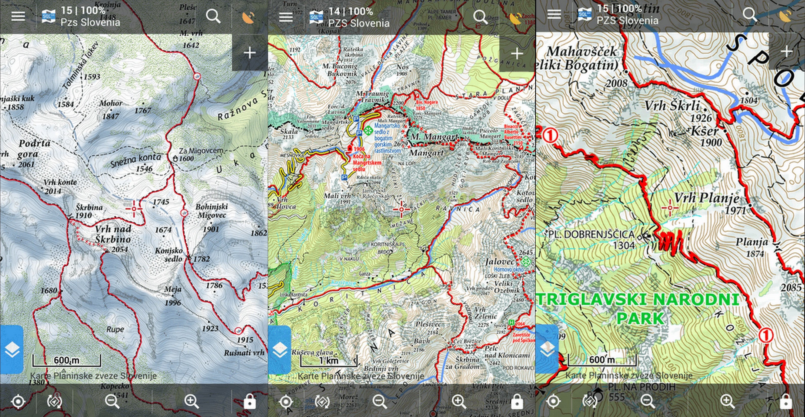 Zemljevidi Planinske zveze Slovenije so najuporabnejši pripomoček za obiskovalce gora. Podrobno prikazujejo planinske poti, koče, stezice, naravne in kulturne znamenitosti, turistično infrastrukturo in vse ostalo, kar je potrebno za gibanje v naravi. Podatke s terena stalno posodabljajo prostovoljci slovenskih planinskih društev. V aplikaciji Locus Map so v merilu 1 : 25.000 na voljo zemljevidi: Bohinj, Triglav, Stol, Jalovec in Mangart, Grintovci in Krnsko pogorje, v merilu 1 : 50.000 pa Triglavski narodni park, Karavanke - osrednji del in Kamniško-Savinjske Alpe.