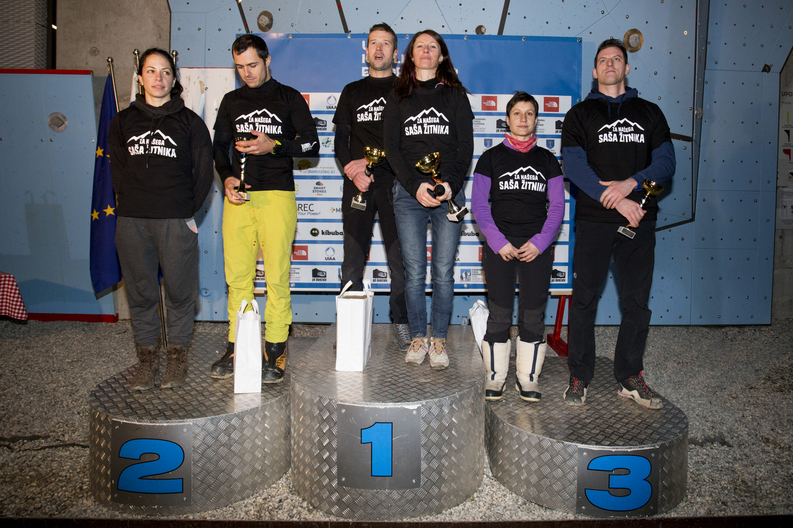 Najboljši v državnem pokalu lednega plezanja Slovenije: Edvin Nepužlan in Marija Jeglič na 2. mestu, zmagovalca Jaka Hrast in Maja Šuštar ter Sara Jaklič in Nace Grgorinič na 3. mestu (foto Urban Urbanc)
