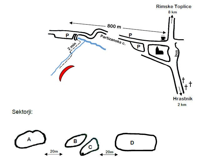 S ceste Rimske Toplice – Hrastnik iz smeri Rimskih Toplic v naselju Dol pri Hrastniku pri cerkvi zavijemo desno. Mimo trgovine Mercator, po Partizanski c. navzgor (cca 800m). Po dveh ostrih, strmih ovinkih je malo asfaltirano parkirišče na levi strani