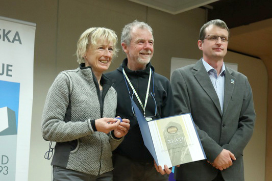 Nives Meroi in Roman Benet dobitnika zlatega častnega znaka planinske zveze (STA)