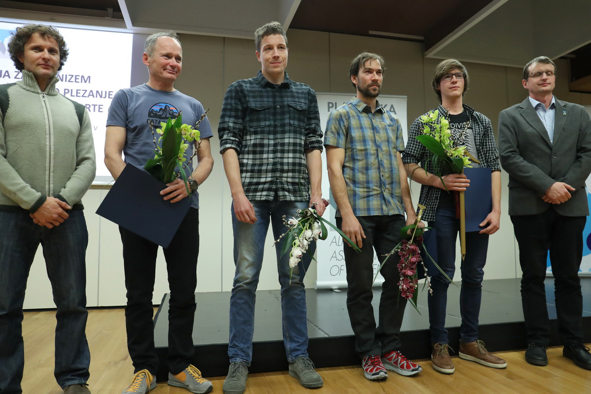 Prejemniki najvišjih priznanj PZS za vrhunske dosežke: France Zupan, Rado Kočevar, Nejc Kuhar, Aleš Česen, Domen Škofic in Janja Garnbret (foto Irena Mušič Habjan)