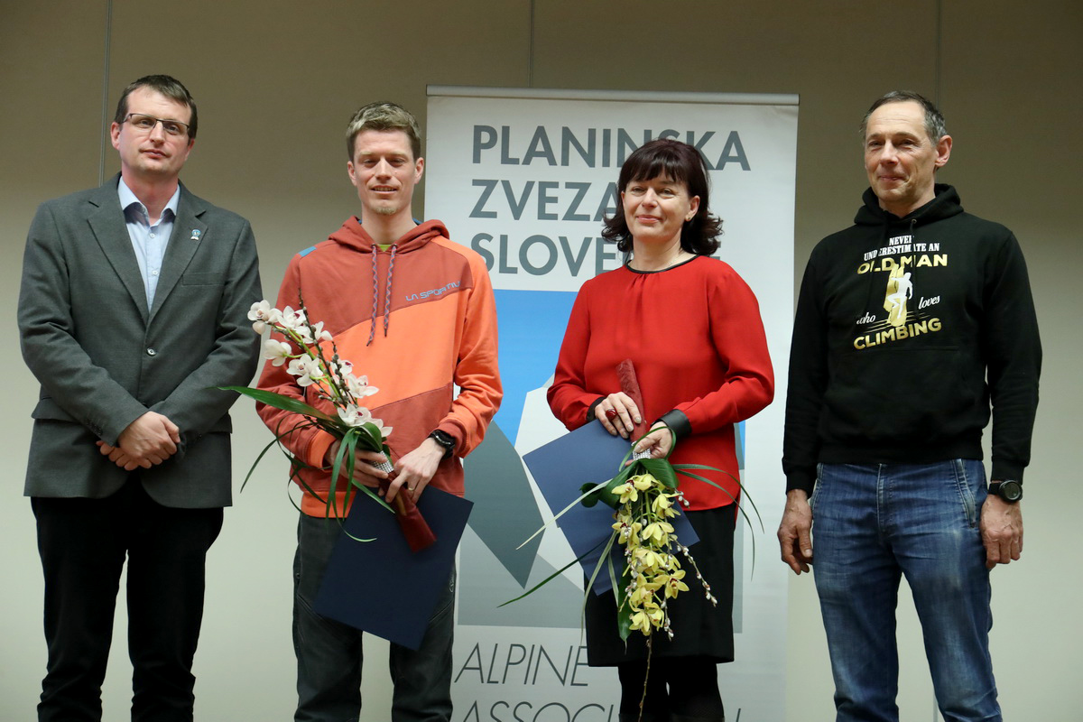 Najuspešnejši turni smučar 2017 Nejc Kuhar in Marta Svoljšak, mama najuspešnejšega lednega plezalca Janeza Svoljšaka, s predsednikom PZS Bojanom Rotovnikom in članom Komisije za Gorske športe PZS Andrejem Pečjakom (foto Irena Mušič Habjan)
