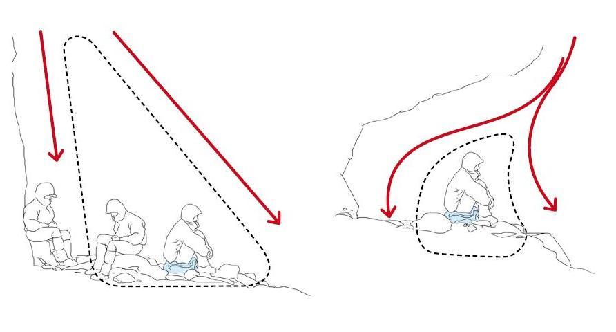 Izogibamo se tudi osamelih, izpostavljenih predmetov (drevesa, viharniki, žandarji …) in pazimo, da se sami ne izpostavimo. S telesom se ne dotikamo sten, po katerih se lahko »sprehodijo« blodeči se tokovi strele. Če smo v kotanji, jami, je najvarnejše mesto sredina jame oz. kotanje. Če smo na robu police, je dobro, da se pripnemo z vrvjo, ki naj od nas teče po tleh.