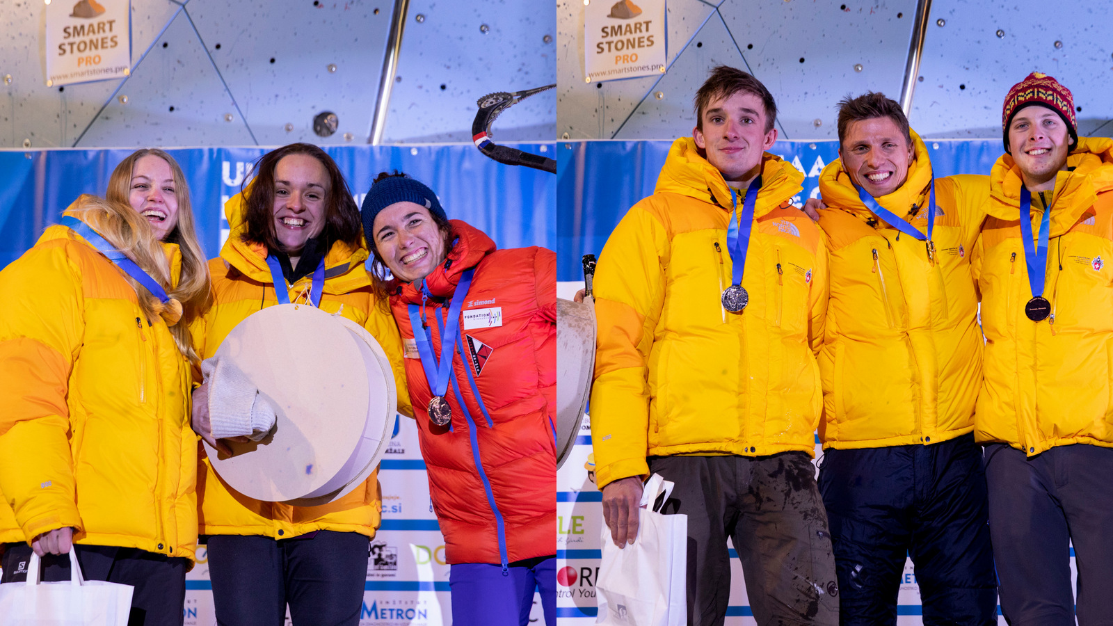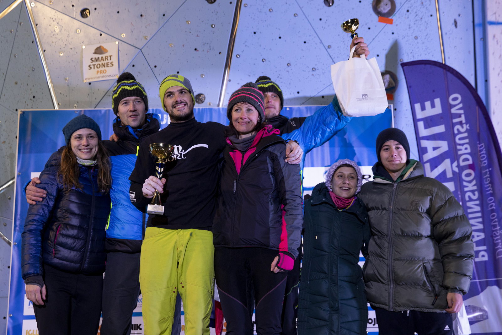 Slovenija zmagovalka pokala narodov v slovensko-hrvaško-srbskem pokalu 2018 v lednem plezanju: drugouvrščena Katja Brunec (SLO) in Jaka Hrast (SLO), zmagovalca Mario Musulin (HRV) in Maja Šuštar (SLO) ter tretjeuvrščeni Edvin Nepužlan (SLO), Katarina Manovski (SRB) in Petar Čičković (SRB) (foto Urban Urbanc)