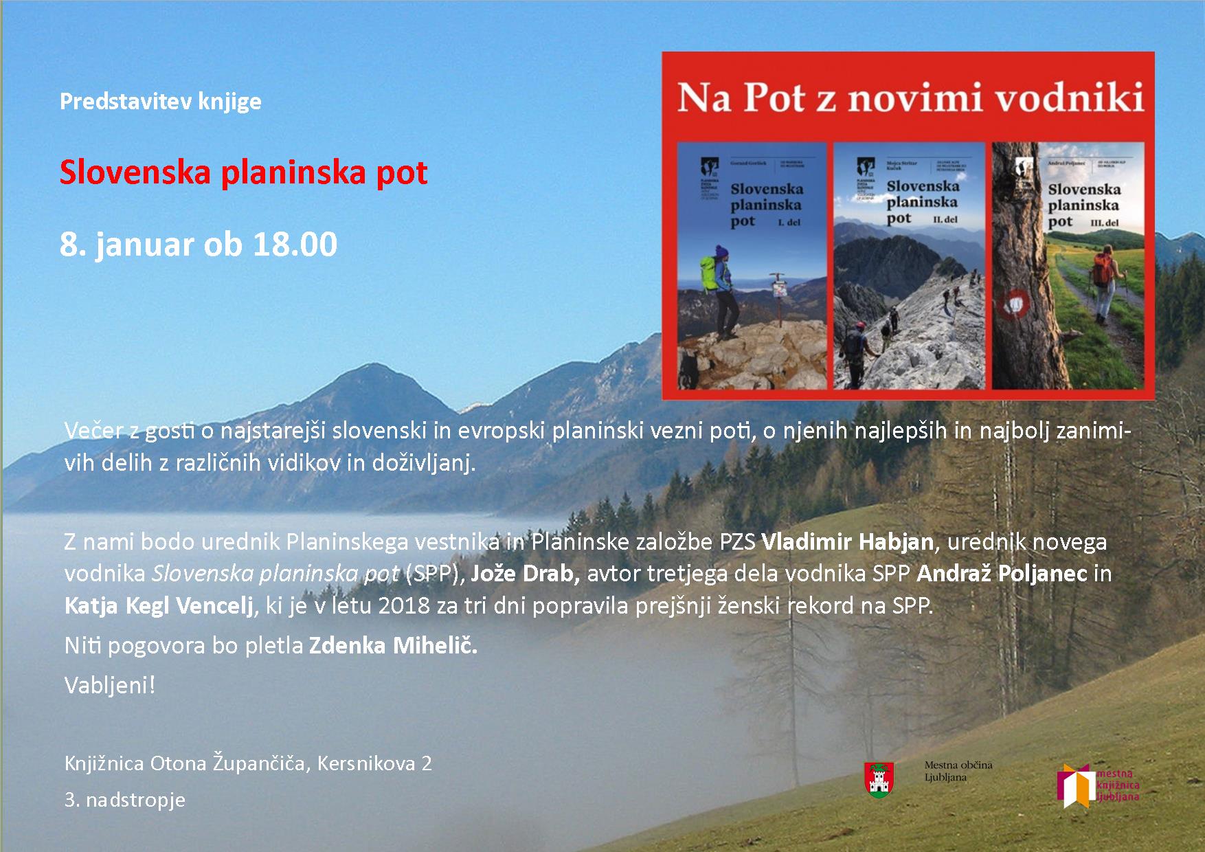 Vabljeni na večer z gosti o najstarejši slovenski in evropski planinski vezni poti, o njenih najlepših in najbolj zanimivih delih z različnih vidikov in doživljanj, ki bo v torek, 8. januarja 2019, ob 18. uri v Knjižnici Otona Župančiča v Ljubljani.