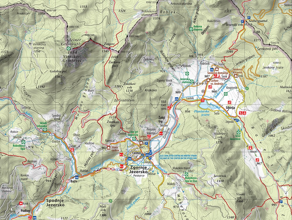 Zemljevid Jezersko - 1 : 25.000 obsega območje med Planino Spodnja Dolga njiva pod Košuto, vasjo Korte/Trögern in Pristovškim Storžičem na severu, Rinkami in Belo/Bad Vellachom na vzhodu, Bivakom pod skuto in Storžičem na jugu ter Storžičem in Planino spodnja Dolga njiva na zahodu. Na zadnji strani zemljevida najdete predstavitev Občine Jezersko, opise sprehajalnih poti ter priročno karto središča prve slovenske Gorniške vasi.