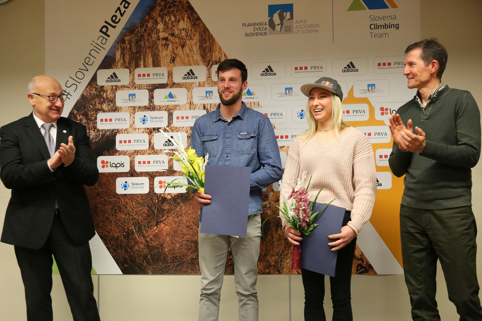 Naj športna plezalca 2019 Jernej Kruder in Janja Garnbret s predsednikom OKS-ZŠZ Bogdanom Gabrovcem in načelnikom Komisije za športno plezanje PZS Alešem Pircem (foto Oto Žan)