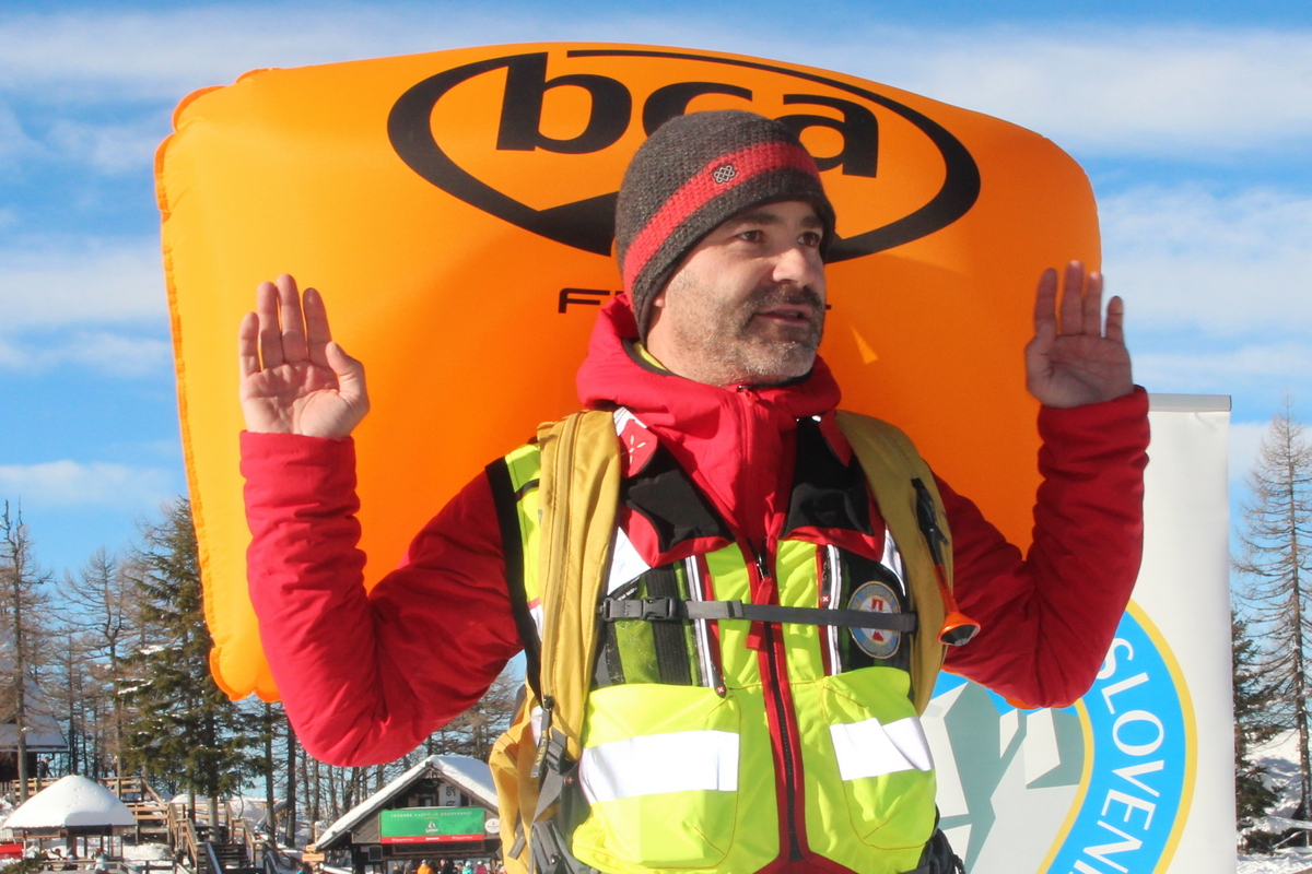Plazovni nahrbtnik z zračnim balonom poveča možnost preživetja, če nas odnese snežni plaz, nismo pa z njim varnejši (foto Manca Ogrin)