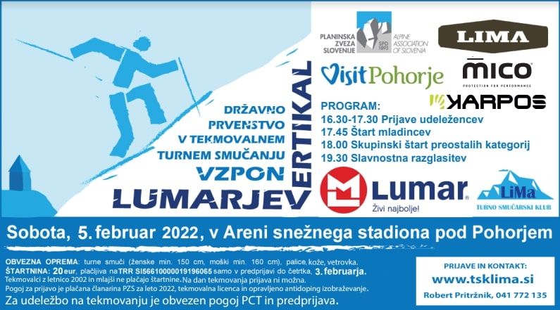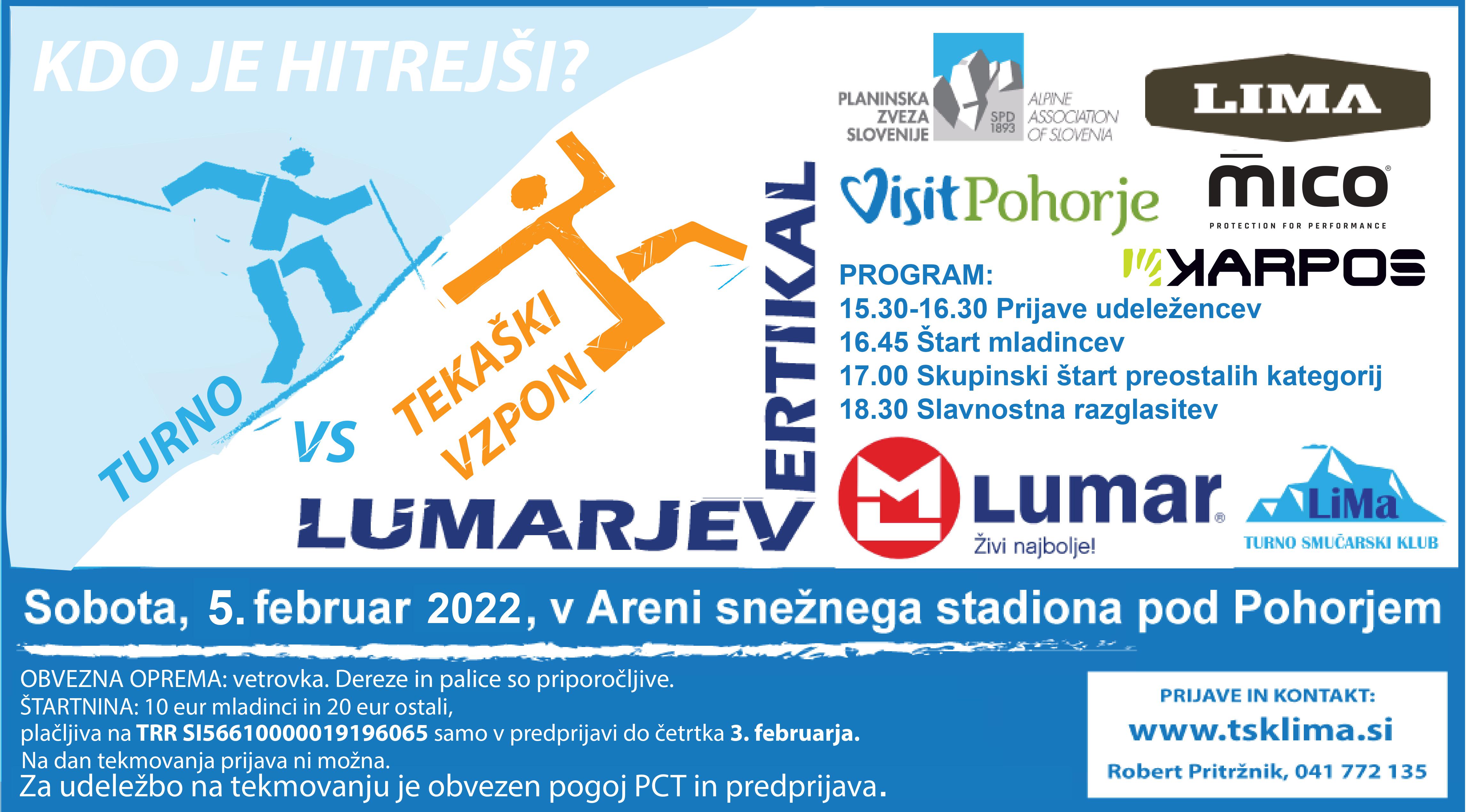Leto je naokoli in čas je, da se ponovno zberemo pod žarometi v areni snežnega stadiona v Mariboru. Drugo izvedbo Lumarjevega vertikala bomo izvedli v soboto, 5. februarja, kot državno prvenstvo v vzponu. Naša želja in želja podkomisije za tekmovalno turno smučanje je, da bi se turnosmučarskih tekmovanj udeleževali tudi mlajši tekmovalci. Zaradi tega smo se letos odločili ponuditi tudi krajšo traso vzpona na Pohorje od Trikotne jase do Bellevueja (490 vm). Mladinci so oproščeni plačila štartnine. Za ostale kategorije bo dolga proga potekala iz arene snežnega stadiona (700 vm). Pohitite s prijavami, ki potekajo do 3. februarja 2022.