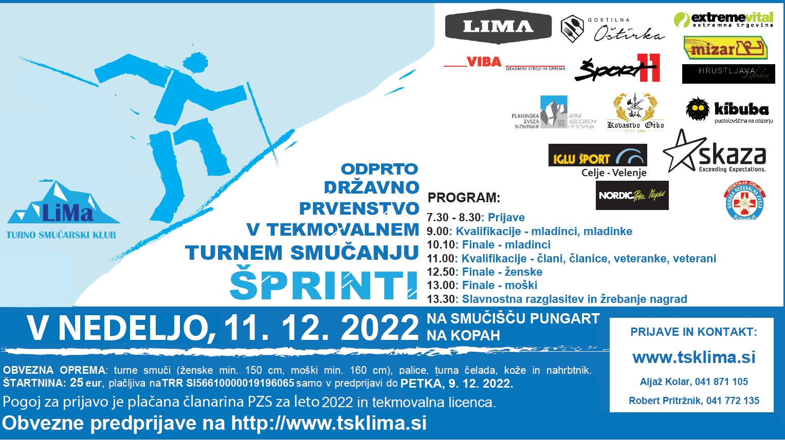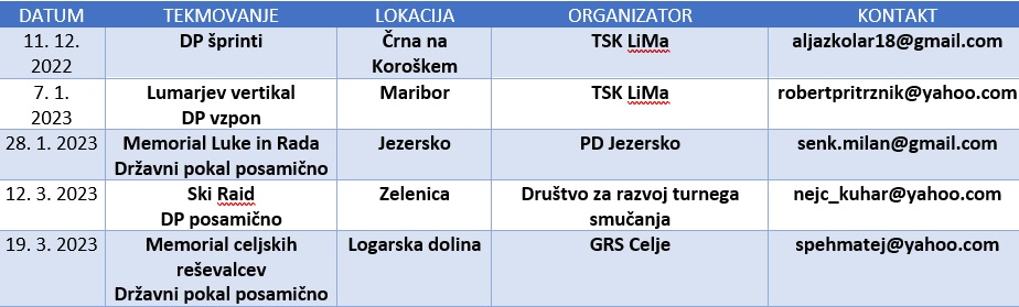 Prva tekma v šprintih bo potekala na smučišču Pungart na Kopah že 11. decembra 2022 in ga organizira Turnosmučarski klub LiMa. Tekma bo izvedena kot odprto državno prvenstvo in so nastop napovedali tekmovalci iz Slovenije, Slovaške, Češke, Poljske in Avstrije.