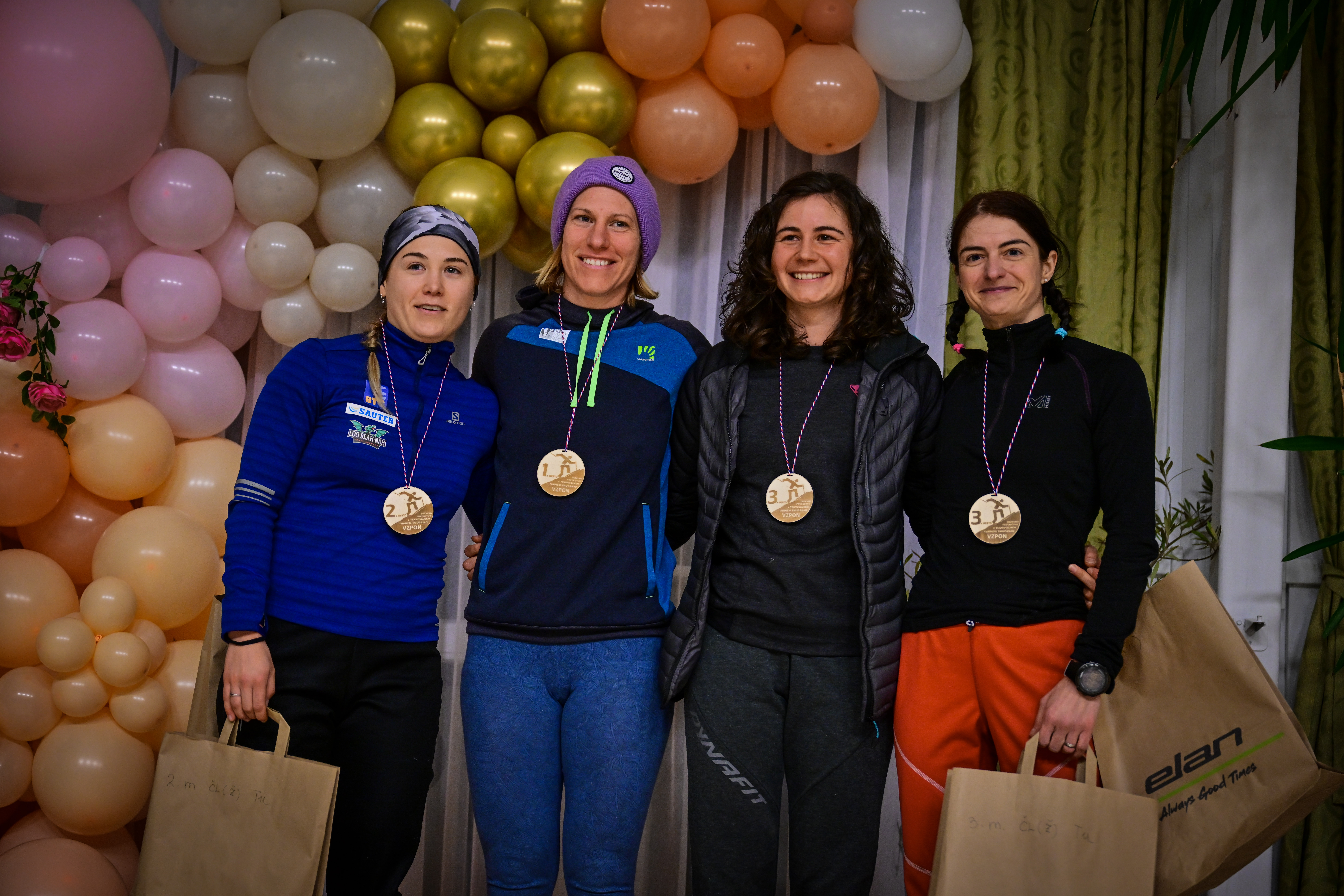 Državna prvakinja v vzponu Karmen Klančnik Pobežin (na sredini), Ana Čufer (levo) na drugem ter Špela Bokal in Špela Zupan (desno) na tretjem mestu na Lumarjevem vertikalu 2023 (foto Marko Pigac)