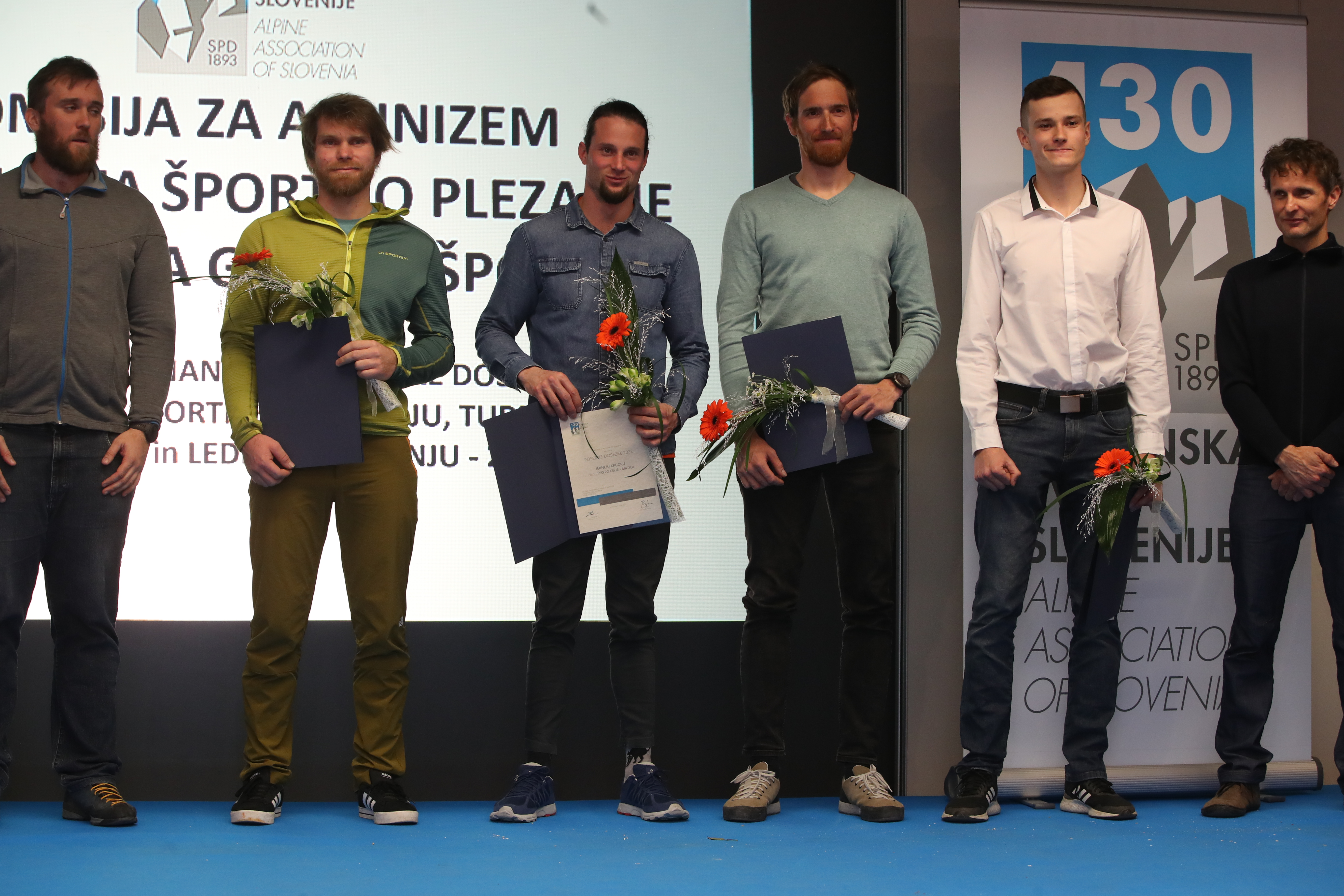 Od leve stojijo: načelnik Komisije za alpinizem Oto Žan, Andrej Jež, Jernej Kruder, Matija Volontar, Bor Levičnik in podpredsednik PZS Miha Habjan (foto Irena Mušič Habjan)