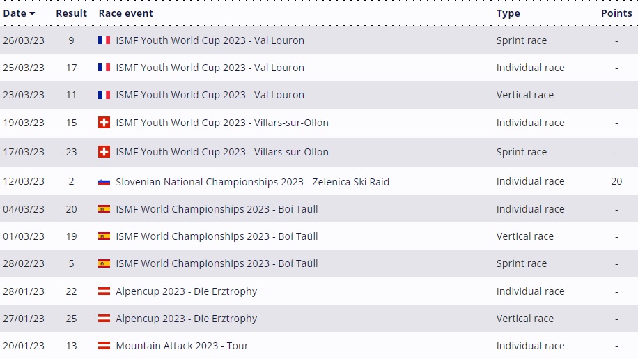 Rezultati Maja Pritržnika v letu 2023 (vir: Skimostats.com)