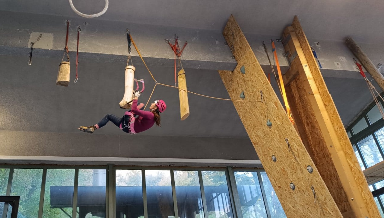 Maja Šuštar Habjan čez lesene sodčke proti vrhu finalne smeri (foto Andreja Ravljen)