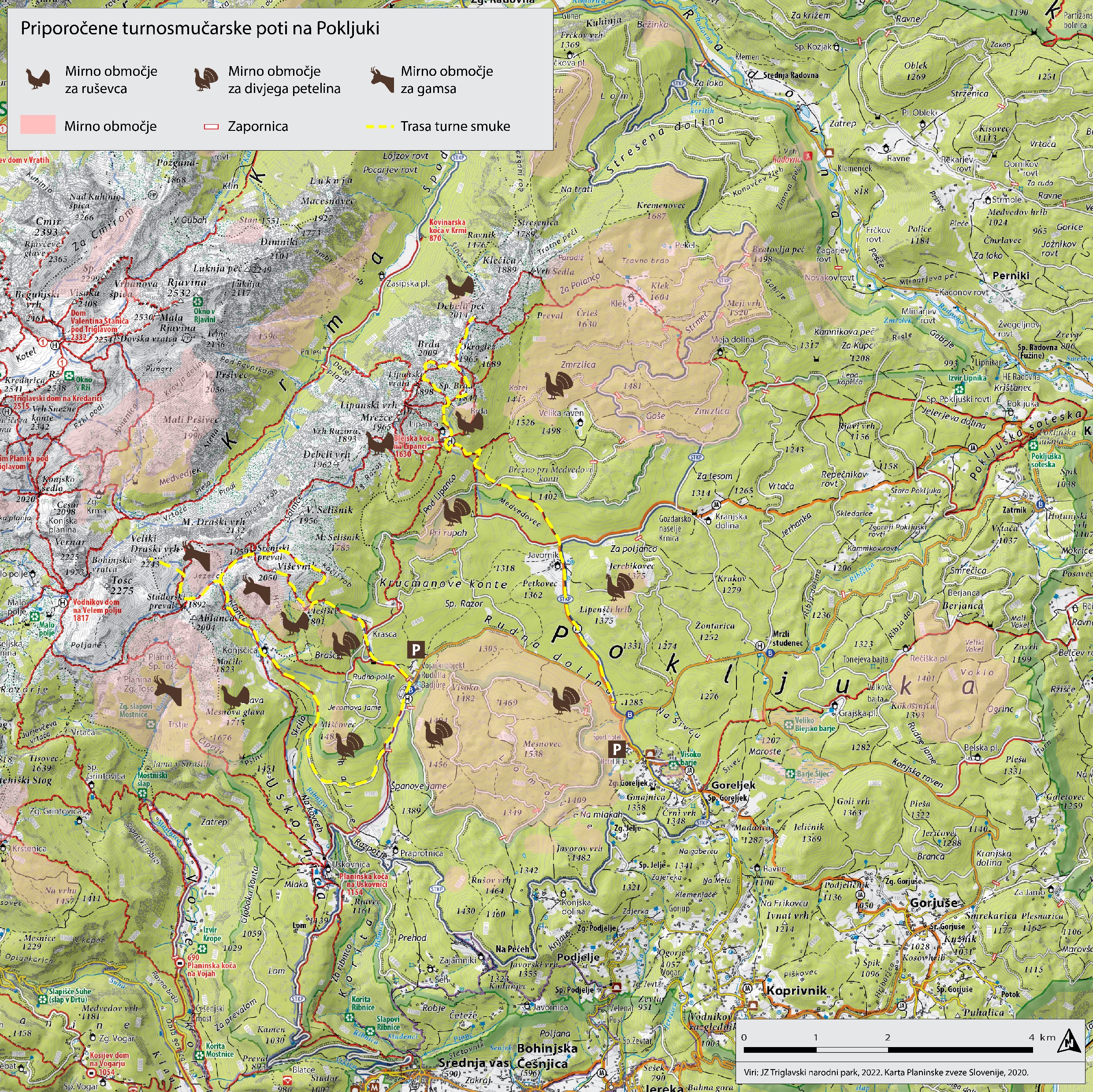 Najbolj priljubljene turnosmučarske poti na širšem območju Pokljuke potekajo v bližini mirnih območij za belko, divjega petelina, ruševca in gamsa, zato je Planinska zveza Slovenije s partnerji projekta VrH Julijcev pripravila zemljevid priporočenih turnosmučarskih poti na Pokljuki, na katerih boste živalim zagotavljali večjo mero miru.