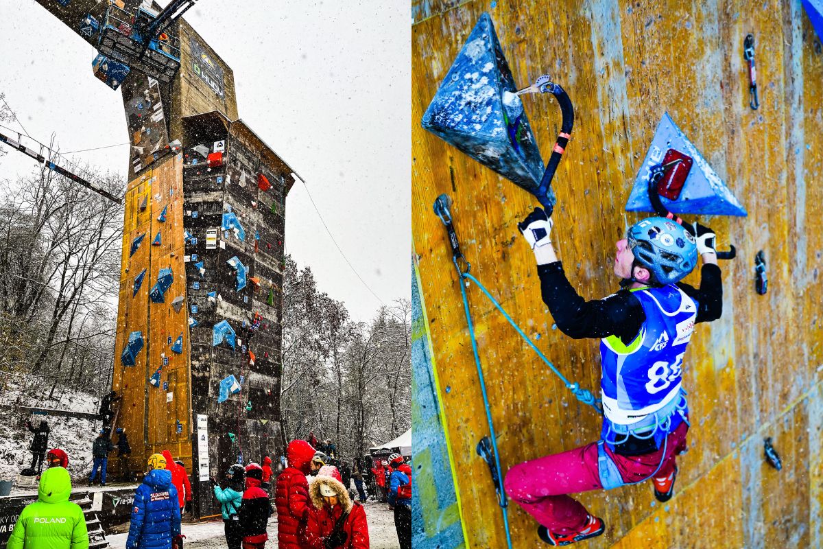 Atraktiven plezalni stolp na 2. tekmi evropskega pokala 2023/24 v tekmovalnem lednem plezanju v Brnu na Češkem, kjer si je Gregor Šegel priplezal odlično 13. mesto (arhiv EP Brno 2023)