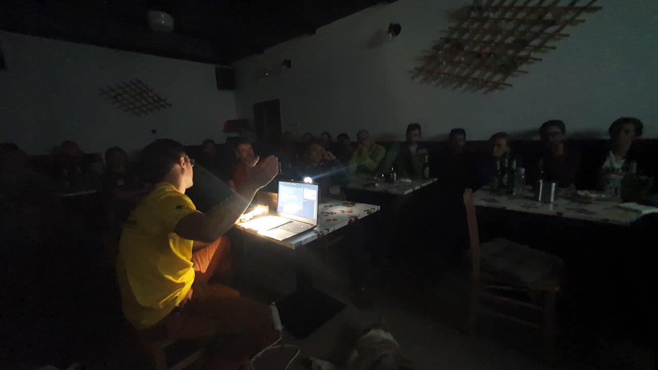 Po 17. uri smo se odpeljali do bližnjega planinskega doma na Vrheh (pod Čemšeniško planino). Postregli so nam z odlično večerjo, potem pa je imel predavanje Filip Princi, izkušeni orodni plezalec z Nove Gorice. Predaval je o treningu za ledno, kombinirano in orodno plezanje ter nam predstavil možnosti plezanja v številnih (tudi težjih) plezališčih za plezanje z orodji. Tekom večera so se nam pridružili še Marko Guna (član KGŠ PZS in izkušeni tekmovalec v tekmovalnem lednem plezanju), Branko in Breda Ivanek ter (med drugim tudi sodnika v tekmovalnem lednem plezanju). Sledila je debata o različnih temah o plezanju z orodji, pogledali smo si še nekaj krajših filmov o kombiniranem ter lednem plezanju. Večer je minil v prijetnem druženju, ki pa sta ga s pravim koncertom obogatila Vili in Sebastjan.