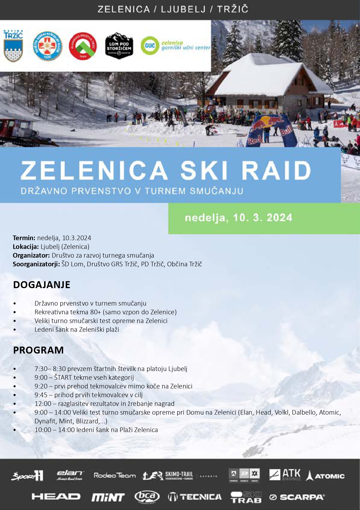 Društvo za razvoj turnega smučanja vabi na že 6. tekmovanje Zelenica Ski Raid, ki je zaradi zelo slabe vremenske napovedi z 10. marca prestavljen na ponedeljek, 1. aprila 2024. Tekma bo sočasno štela tudi za državno prvenstvo v turnem smučanju (posamezno). Tekmovanje bo spremljal pester spremljevalni program. >>> Zaradi slabe vremenske napovedi je tekmovanje ODPOVEDANO.