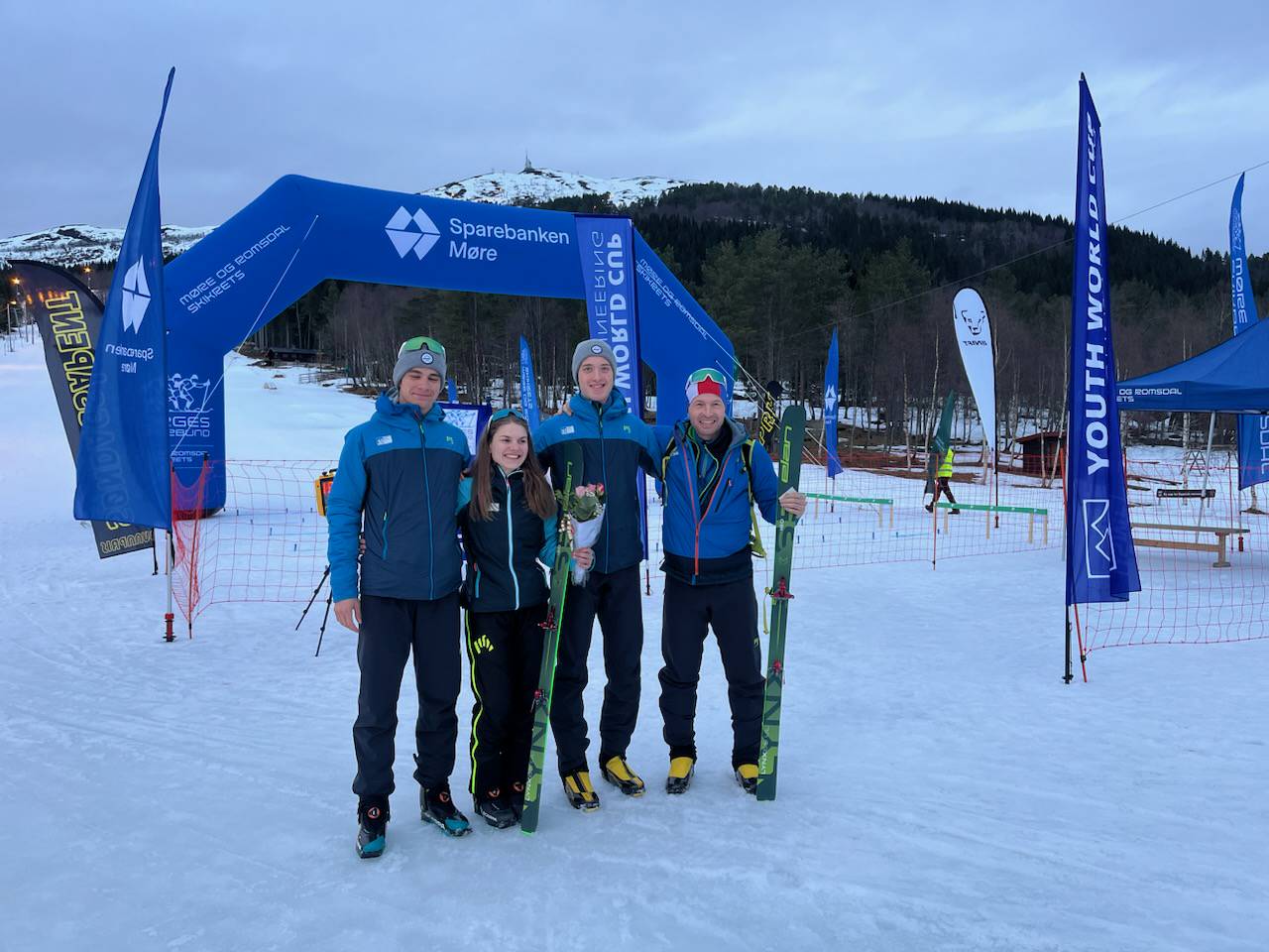 Slovenska reprezentanca na zadnji letošnji postaji mladinskega svetovnega pokala na Norveškem: Klemen Španring, Klara Velepec, Maj Pritržnik in Robert Pritržnik (foto Robert Pritržnik)