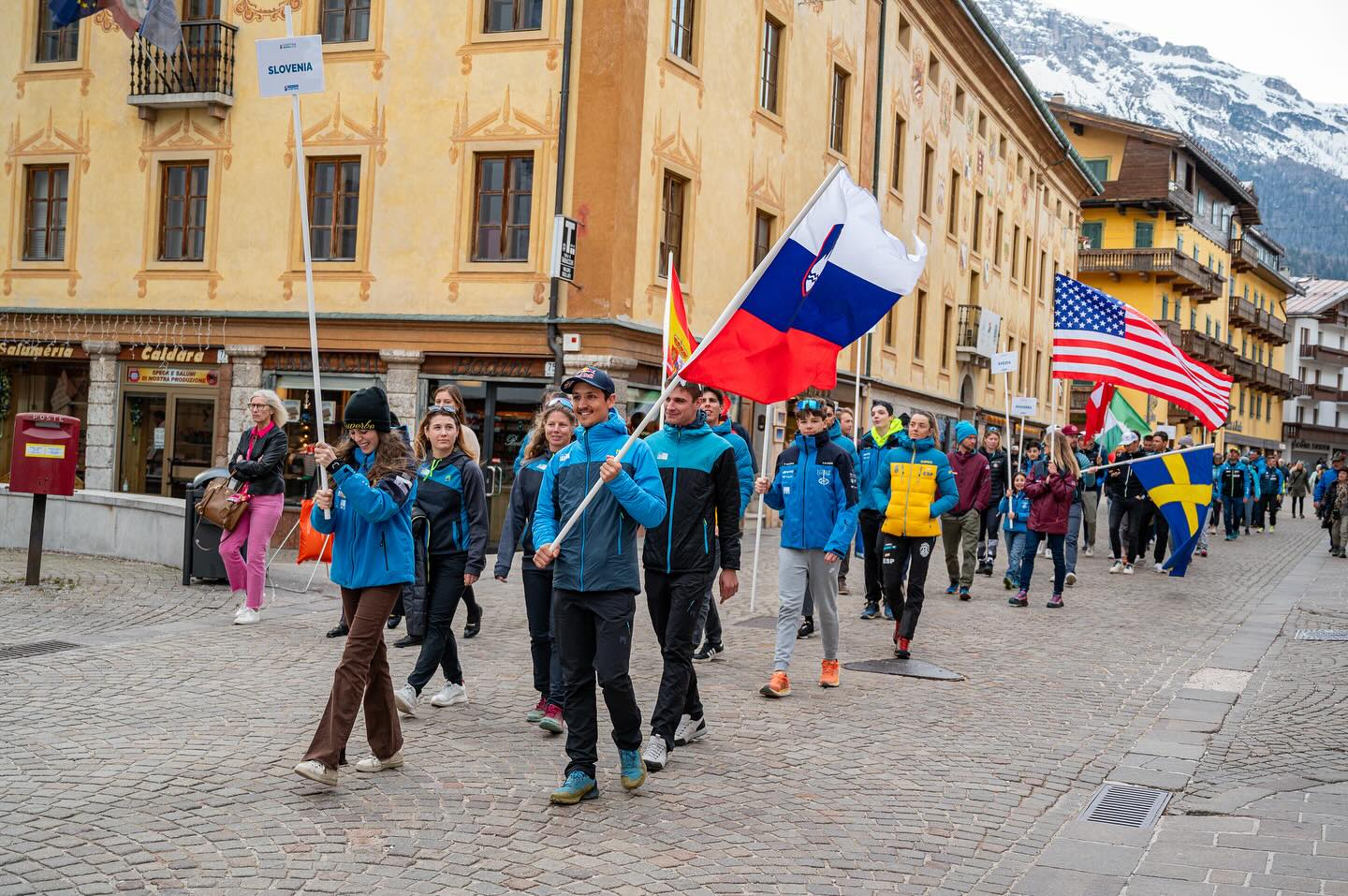 Slovenska reprezentanca v tekmovalnem turnem smučanju ponosno na odprtju tekme SP v Cortini d’Ampezzo (foto Skimostats)