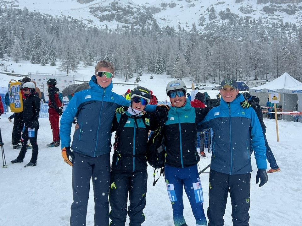 Člani slovenske reprezentance v tekmovalnem turnem smučanju Maj Pritržnik, Rea Kolbl, Luka Kovačič in Klemen Španring uspešni na finalni tekmi sezone 2023/24 v Cortini d'Ampezzo (foto Skimostats)